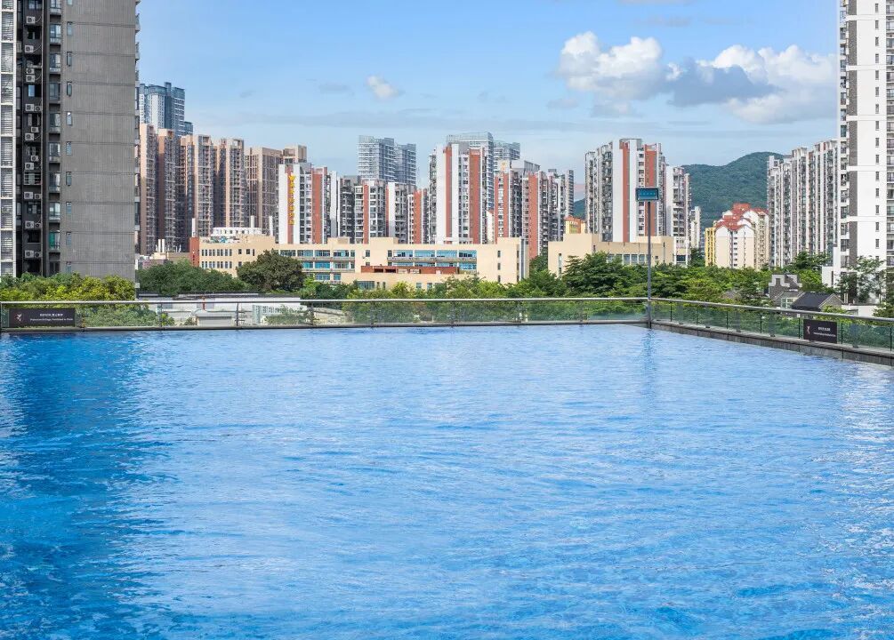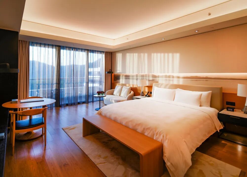 酒店拥有365间豪华客房和无敌景观私家阳台,酒店室内外恒温泳池相互贯通,掩映在园林中的室外无边际泳池,与湖面浑然一体,还拥有10000平方米私家园林,观日出赏晚霞,在这里享受美食康养、天伦之乐、欢聚团圆的品质场景。