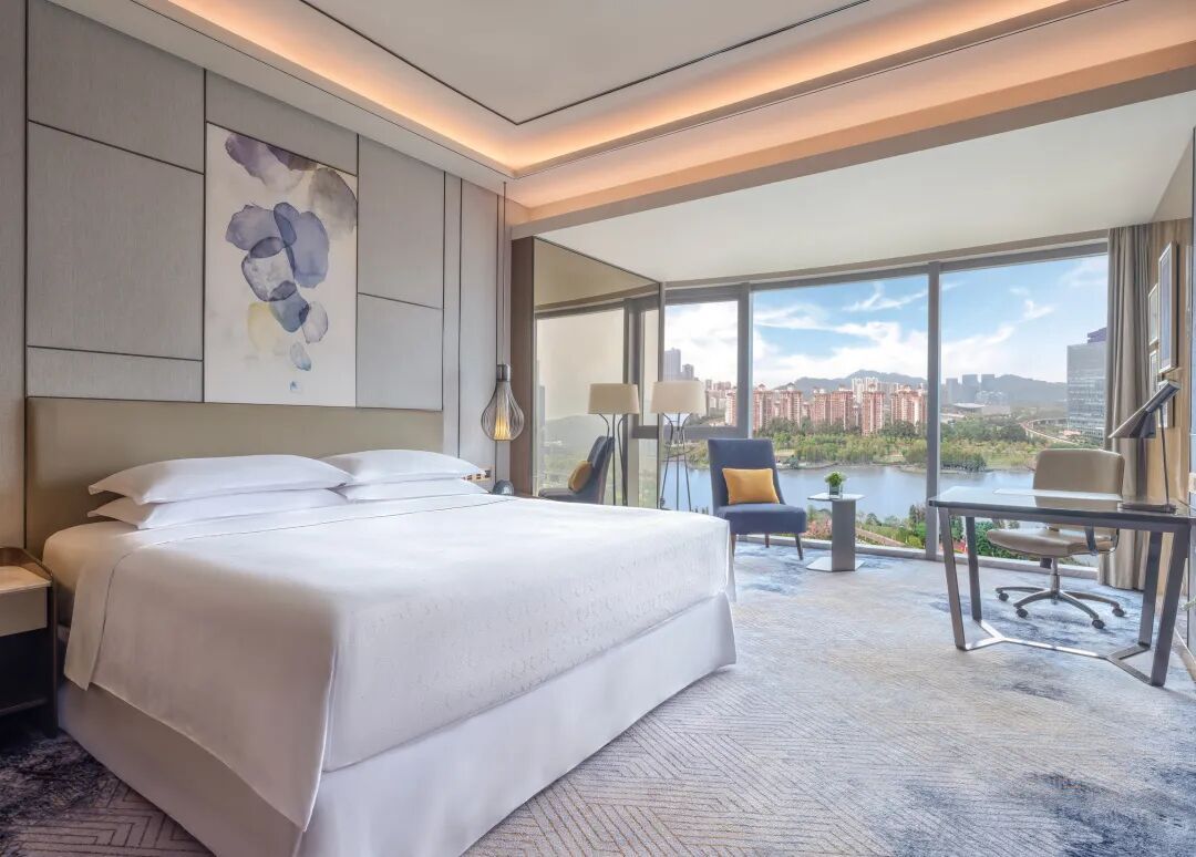 酒店客房及套房共计291间,全落地玻璃的窗户设计可一览无余蕉门河美景。现代简约的外观设计,室内融入南沙水乡文化元素,凭窗而眺,尽享蕉门河旖旎风光。